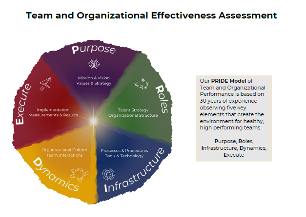 Our PRIDE Model of Team and Organizational Performance is based on 30 years of experience observing five key elements that create the environment for healthy, high performing teams: Purpose, Roles, Infrastructure, Dynamics, Execute. Try the assessment to see where your team excels and where there might still be space for growth.